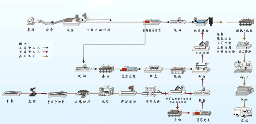 公司擁有國內先進制管流水線6條。從分條開卷、清洗脫脂、緄軋成型、焊接、打磨、定徑、在線固熔、渦流探傷、標志噴碼、定尺檢驗、氣密性試驗、檢驗包裝,都嚴格按照GB/T12771-2000《流體輸送用不銹鋼焊接鋼管》、ASTM