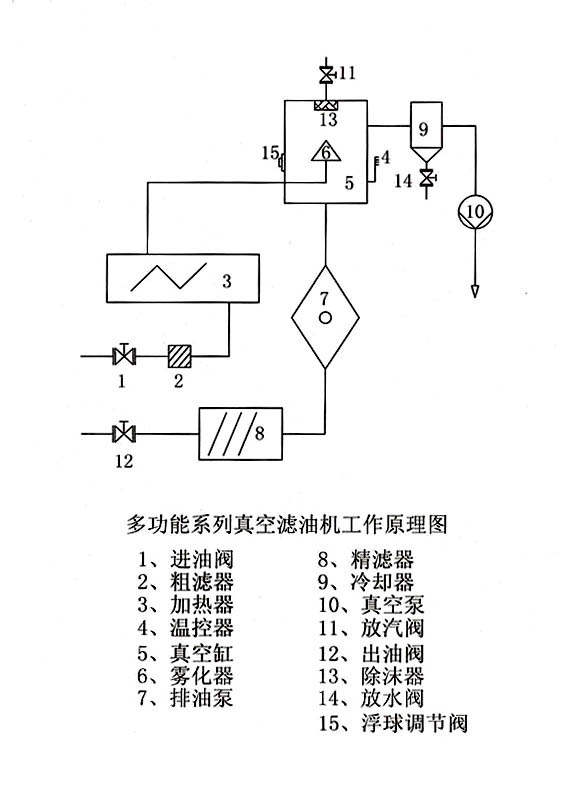 開動真空泵系統,真空表的負壓達到-0、06Mpa時可以打開進油閥(1),待凈化油液從主油箱進入粗濾器(2),經過粗濾器除去油中的較大水顆粒和雜質。粗凈化的油進入加熱器(3),加熱后的油液進入真空缸(5),再通過霧化器(6),在一定的溫度和真空條件下、油水充分霧化、水份蒸發向上、油液降下、油中所含的水份和氣體霧化后被真空泵抽出。進入冷卻器(9),通過冷卻的蒸汽,部分被冷卻成水,部分未冷卻成水,但降溫后被真空泵(10)抽出,從排氣口排出。時刻要觀察真空缸的油位,當油位達到觀察孔中心時,可以將排油的主令開關旋至自動上即可,當真空缸油達到高油位時,排油泵自動排油,當油位達到低油位時自動停泵。靠浮油調節閥(15)控制排油泵,排油泵將油液從真空缸打入精濾器(8)除去微粒雜質后排入主油箱,排油時必須提前打開排油閥(12)。